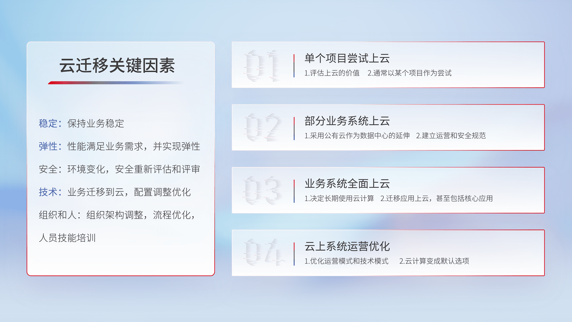 结合实际业务,,,,从规划设计、、、、云平台选型、、云原生改造、、、数据迁移、、集成交付,,,,迁移全过程为客户识别最佳上云路径,,,做好风险识别管理,,,,设计网络架构、、身份权限、、、安全审计合规、、、操作审计、、、、日志审计、、、监控告警策略、、、、多站点容灾设计等,,对云上基础设施进行整体规划,,提升IT治理水平,,以满足弹性、、高可用、、高性能的需求。。。