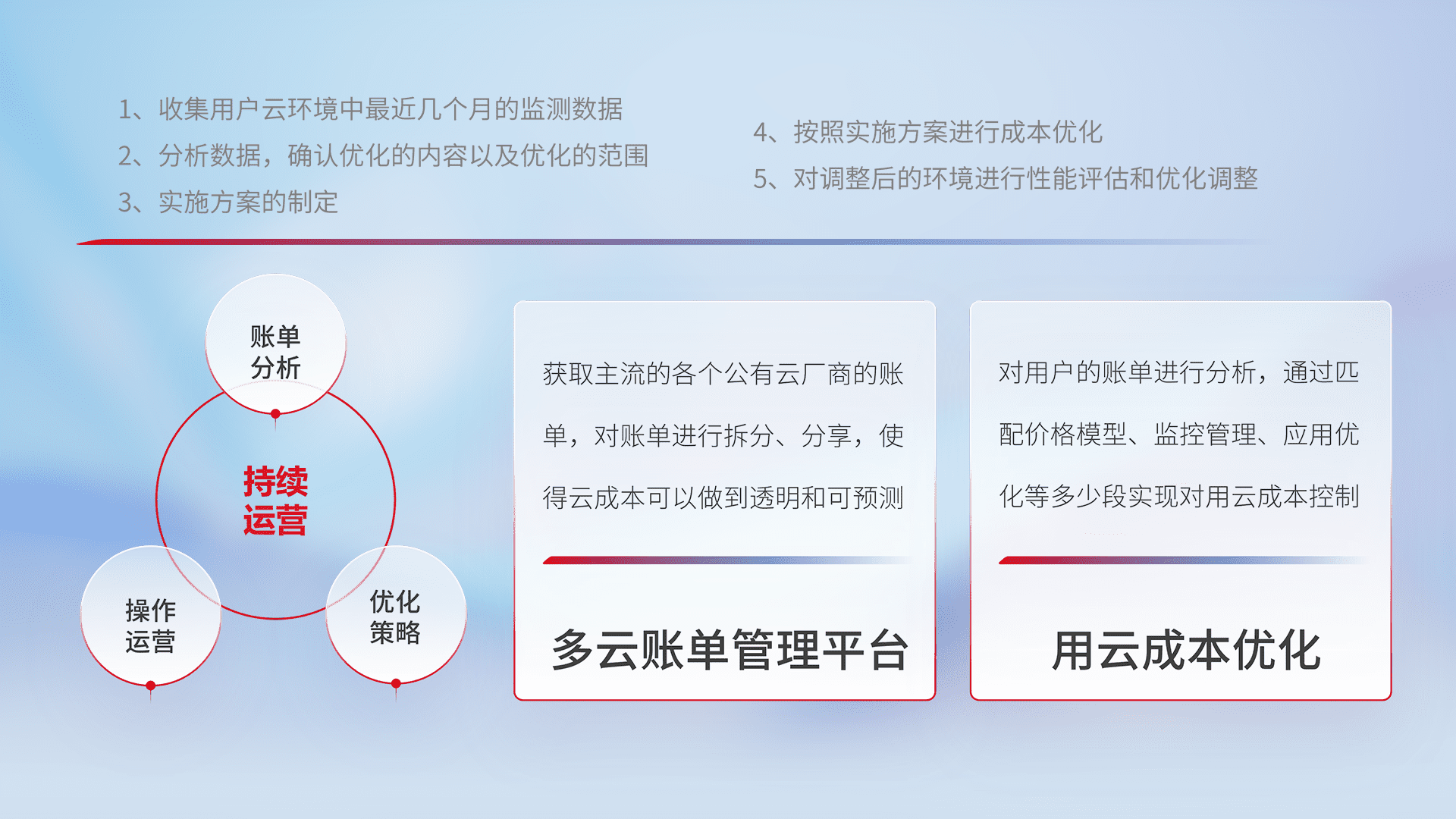 通过多云纳管,,,,以统一的资源数据模型把客户的云资源进行抽象和封装,,,进而实现对多云资源的统一操作,,,,保障云资源管理的可靠性、、、、稳定性与可用性。。。量身定制化运维内容,,配置、、、开发运维、、补丁管理、、、、备份、、、、监控、、认证和访问管理、、审计和日常巡检等,,,保障在用云过程中的可靠度,,稳定度以及高可用率。。。